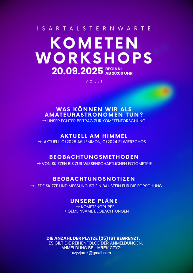 ![]() 📌 Ablauf des Abends: 20:00 – 21:30 Uhr – theoretischer Teil und Diskussion + Pause ab 22:00 Uhr – Kometenbeobachtung auf der Dachterrasse + CDK 🌠 Am Himmel erwarten uns diesmal: C/2024 E1 Wierzchos (~12 mag) am Abend. C/2025 A6 Lemmon (aktuell 9,6 mag!) ab 01:30 Uhr. (Er wird immer heller: ~8 mag, ein echtes Herbst-Highlight!) Die Veranstaltung ist offen – sowohl für Mitglieder unseres Vereins als auch für Gäste von außerhalb, einschließlich Jugendlicher. Eine gute Gelegenheit, das Thema Kometen bekannt zu machen und neue Interessierte für unsere Arbeit zu gewinnen. Wir treffen uns unabhängig vom Wetter. Falls es nicht mitspielt, findet nur der theoretische Teil statt. |