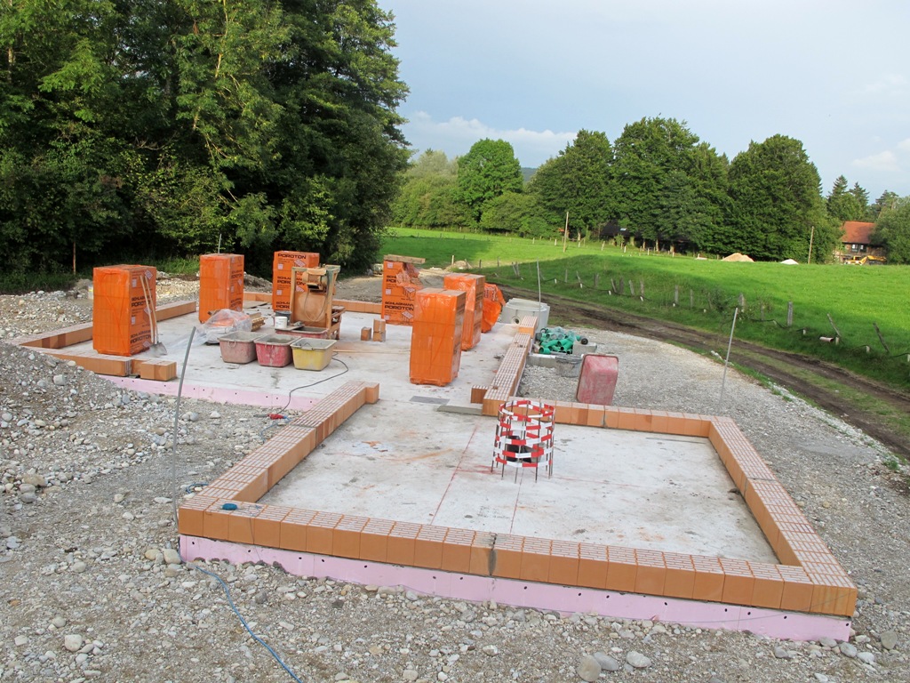 Mo 26.08.: Tag 1 nach den Betriebsferien des Bauunternehmens Thomas Kos: Die erste Reihe des Ziegelmauerwerks liegt.